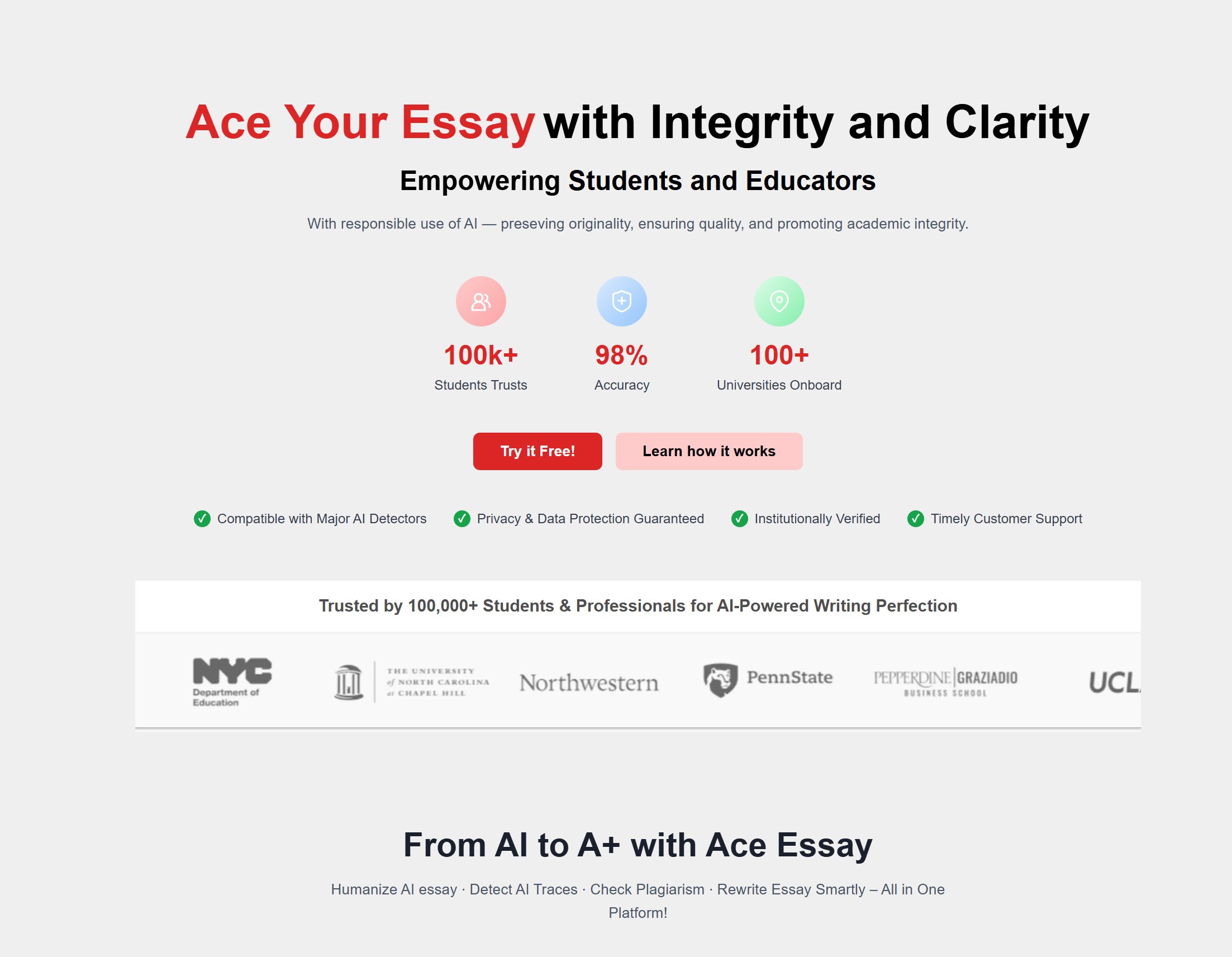 AceEssay is specifically designed for those who need accurate and reliable AI detection. Whether you’re dealing with academic papers, research reports, or SEO-optimized content, AceEssay ensures that your writing stays authentic by accurately detecting AI-generated text in all forms. Let’s explore its features and performance.