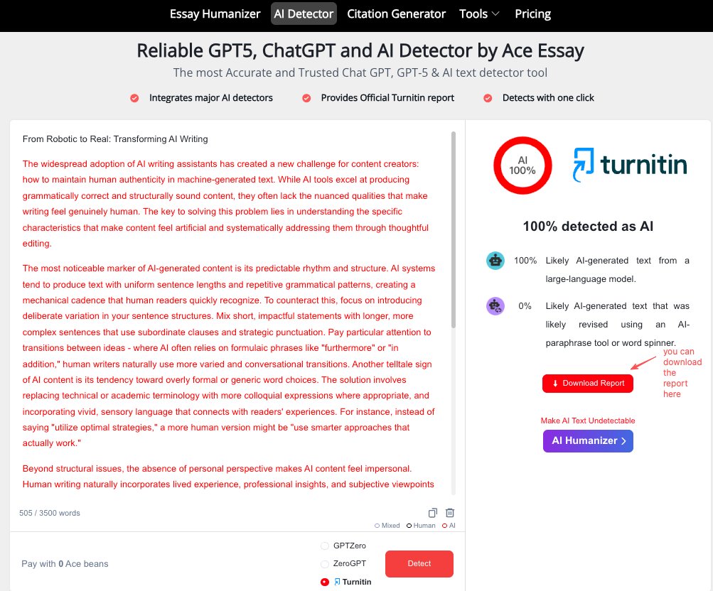Here is a picture of the aceessay.ai detector, where you can find a button of “Download Report” which enable you to get the true turnitin report.